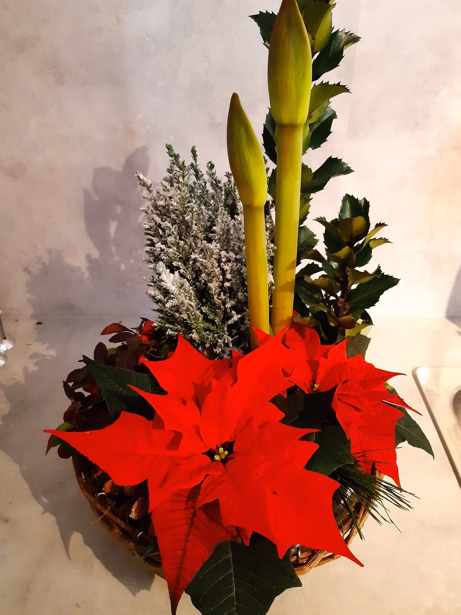 Letar du efter en vacker och tidlös julgrupp att pryda hemmet med eller ge bort som gåva? Detta är en klassisk julgrupp med bland annat amaryllis och andra juliga blommor som skapar en varm och stämningsfull känsla. Varje julgrupp sätts ihop för hand så avikelser från bilden kan förekomma.